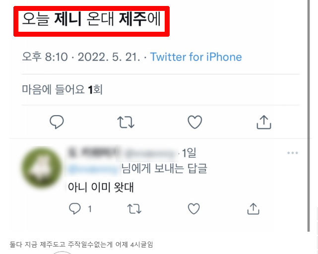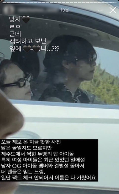 해당 게시글의 작성자는 "오늘 제보 온 핫한 사진"이라며 "닮은꼴일지도 모르지만 제주도에서 찍힌 두 명의 탑 아이돌, 특히 여성 아이돌은 최근 있었던 열애설 남자 OG 아이돌 멤버와 결별설 돌아서 더 팬들이 믿는 느낌. 일단 팩트 체크 안 되어서 이름은 가 가렸어요"라고 작성했습니다.