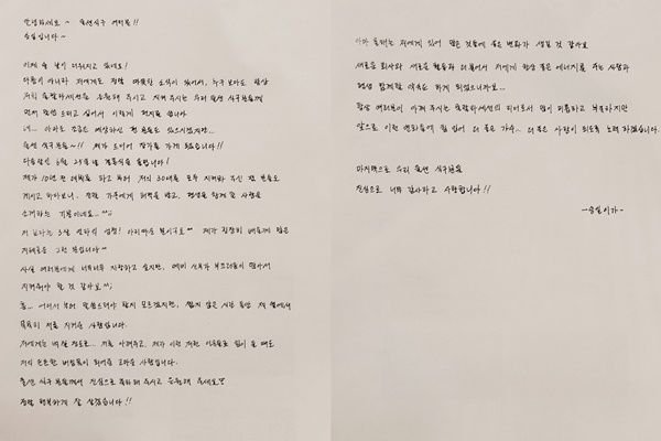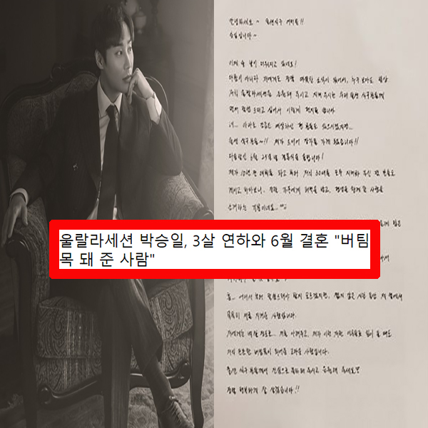 박승일은 자필 편지를 통해 "10년 전 데뷔를 하고부터 저의 30대를 모두 지켜봐 주신 팬분들도 계시고 하다 노비 정말 가족에게 허락을 받고 저와 평생을 함께할 사람을 소개하는 기분"이라며 각별한 팬 사랑을 드러냈습니다.