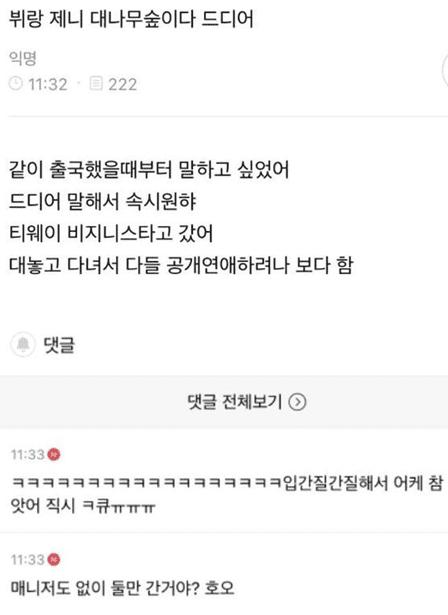 아울러 23일 익명 온라인 커뮤니티에는 '뷔랑 제니 대나무숲이다 드디어'라는 제목의 글이 올라왔습니다. 해당 게시글 작성자는 "같이 출국했을 때부터 말하고 싶었다. 드디어 말해서 속시원하다"라며 "티웨이 비즈니스 타고 갔다. 대놓고 다녀서 다들 공개연애 하려나보다 했다"라고 밝혔습니다.