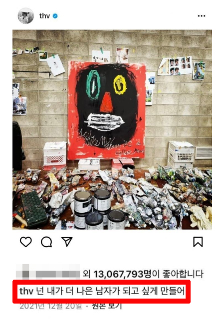 뷔는 지난해 12월 20일 인스타그램에 "넌 내가 더 나은 남자가 되고 싶게 만들어"라는 글을 올렸습니다. 이후 며칠 간격을 두고 제니가 사진을 찍었던 조형물 앞에서 찍은 사진을 공개했습니다.