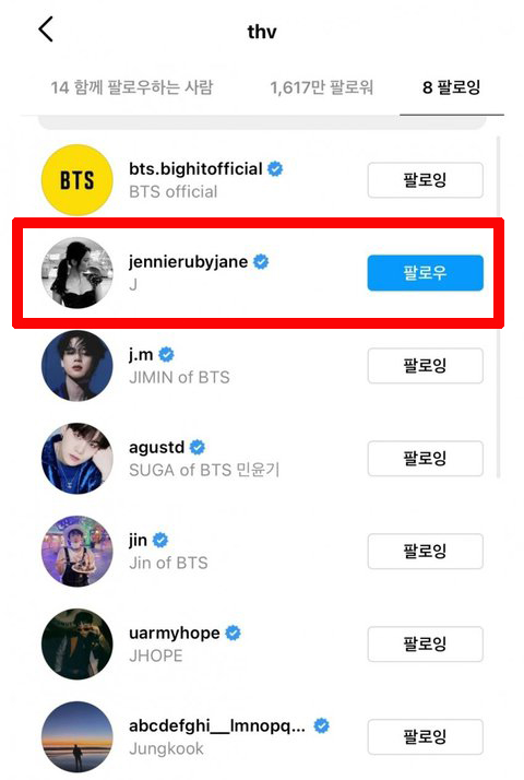 지난해 12월 방탄소년단(BTS) 멤버들이 데뷔 이후 8년 만에 개별 인스타그램을 개설하며 12월 7일 뷔의 팔로잉 리스트에는 블랙핑크 멤버 제니의 개인 인스타그램 계정이 추가된 바 있습니다. 앞서 뷔는 멤버 6인의 개별 계정과 함께 방탄소년단 공식 계정 단 7개 만을 팔로우하고 있었는데요.