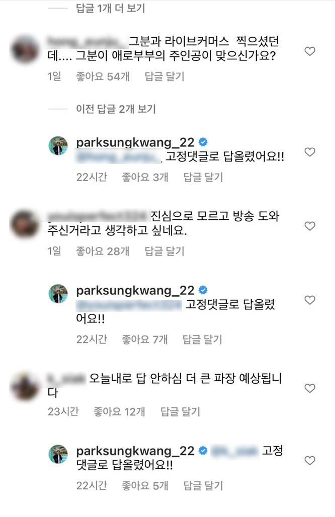 박성광은 "오늘 아침부터 황당한 일이 생겨서 댓글로 말했음에도 계속 추측성 댓글을 남겨 글을 올린다. 명확히 말씀드리면 '애로부부' 당사자 그 분과는 1년 전 선배님의 도움 요청으로 라이브커머스 두 번, 방송을 위한 사전미팅 한 번 진행한 것이 전부"라고 밝혔습니다.
