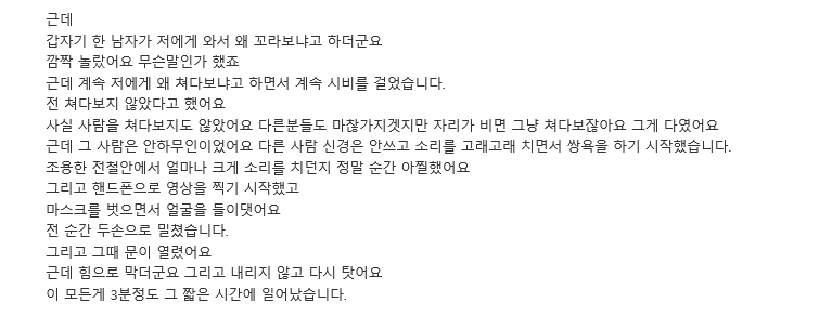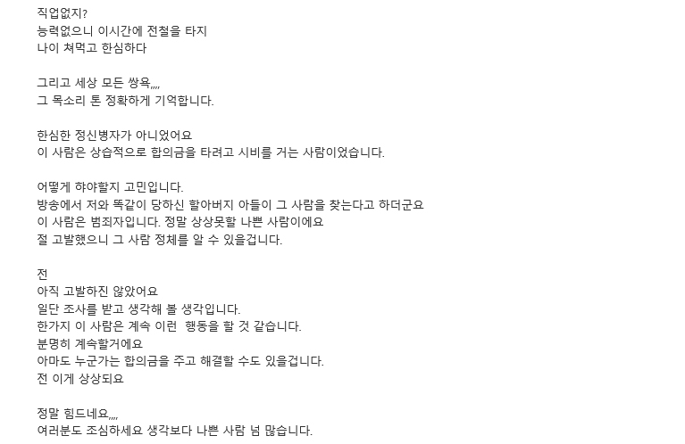 A씨는 "(영상 속 모습과 똑같이) 짝다리를 짚고 주머니에 두 손을 넣고 똑같은 가방을 메고 있었다"며 "내게 '직업 없지? 능력 없으니 이 시간에 전철을 타지 나이 X 먹고 한심하다고 했다 상습적으로 합의금을 타려고 시비를 거는 사람이었다"고 분통을 터트렸습니다.