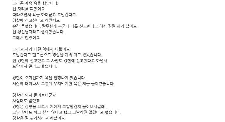 A씨는 남성을 두 손으로 밀친 뒤 자리를 피했으나 남성은 A씨를 계속 뒤쫓으며 폭언을 이어갔습니다. A씨는 "태어나서 그렇게 무지막지한 욕은 처음 들어봤다"며 "지하철에서 내려 경찰에 남성을 경찰에 신고하자 남성도 저를 신고했다"고 말했습니다.
