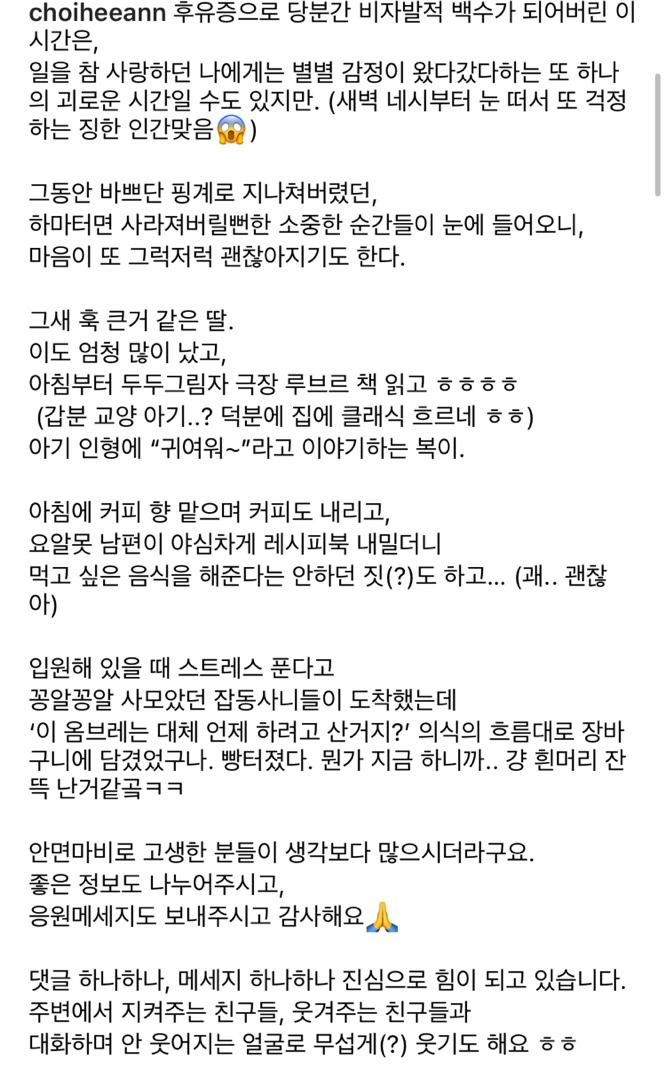 최희는 1일 자신의 인스타그램에 안면마비 증세로 입원 치료를 받은 뒤 퇴원한 후 일상을 언급했습니다. 이날 최희는 "후유증으로 당분간 비자발적 백수가 되어버린 이 시간은 일을 참 사랑하던 나에게는 별별 감정이 왔다 갔다 하는 또 하나의 괴로운 시간일 수도 있지만 그동안 바쁘다 핑계로 지나쳐버렸던 소중한 순간들이 눈에 들어오니 마음이 괜찮아지기도 한다"는 글을 게재했습니다.
