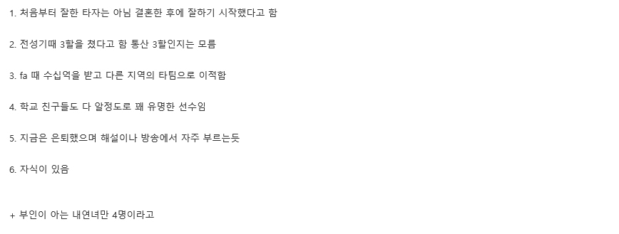 또한 남편이 현역 선수이던 시절 소속 구단 감독이 아내를 불러 "남편을 혼자 두지 말아라"라고 충고까지 했다는 사실이 밝혀져 충격을 더했는데요. 현재 야구선수 남편과는 별거 2년 차며 아직 이혼은 하지 않은 상황이라고 알려졌습니다.
