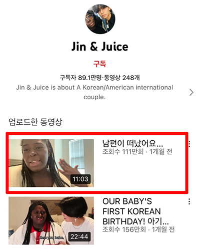 진앤쥬스 부부는 구독자 89만 명을 보유한 유튜버입니다. 고한과 세로즈는 한국인 남편과 미국인 아내가 알콩달콩하게 사는 일상을 공개해 많은 사랑을 받았습니다.