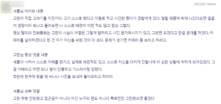 해당 폭로 영상 이후 세로즈는 라이브 방송을 통해 "가정폭력을 행한 적은 절대 없었다. 고한이 스스로 극단적인 시도를 했다"며 "이미 경찰에서도 조사를 마쳤고, 고한도 인정해서 법적으로 증거가 있다"고 해명했습니다.