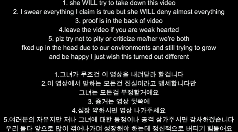 영상에서 고한은 "이 영상에서 말하는 모든 것이 진실이라고 맹세합니다만 그녀(아내)는 모든 걸 부정할 것"이라며 자신이 아내인 세로즈에게 학대를 받았다고 주장했습니다.