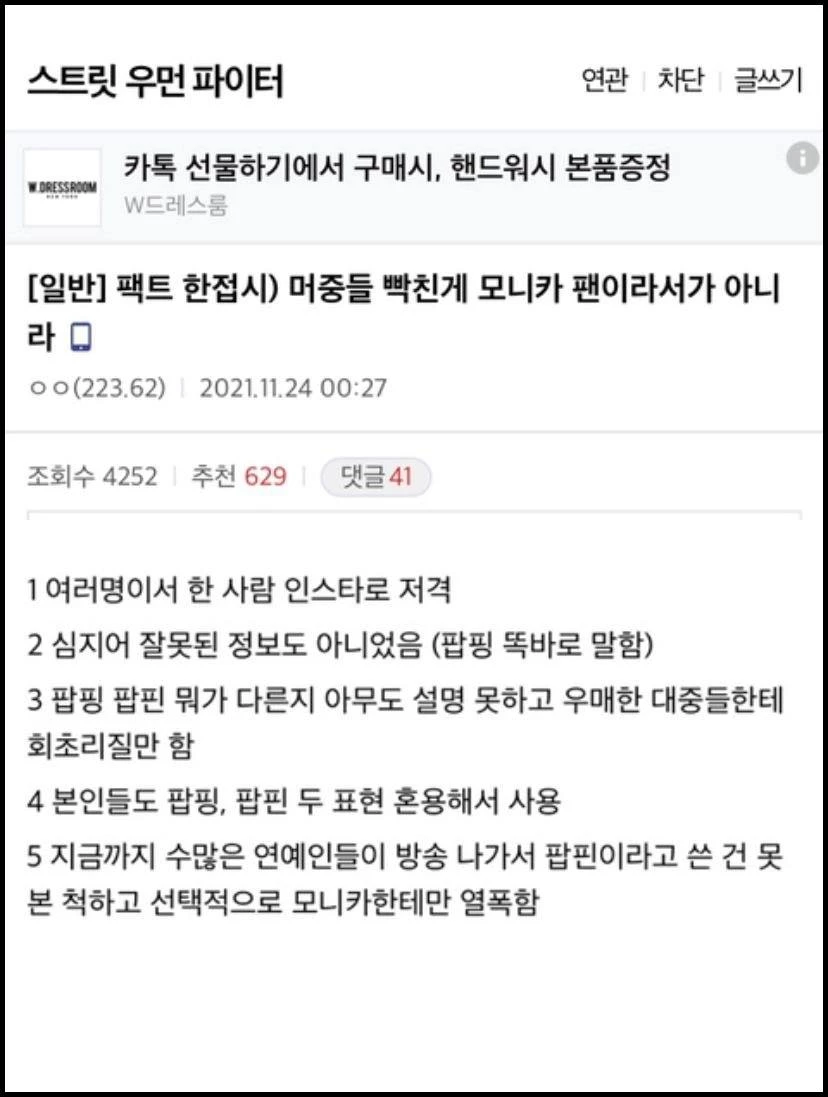 때 아닌 스트릿댄스 장르 논란에 누리꾼들은 모니카를 지적한 댄서들을 비판했고 모니카를 저격한 댄서 명단이 만들어지기도 했습니다.