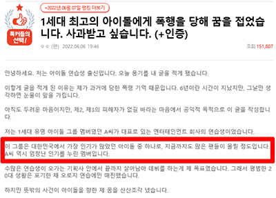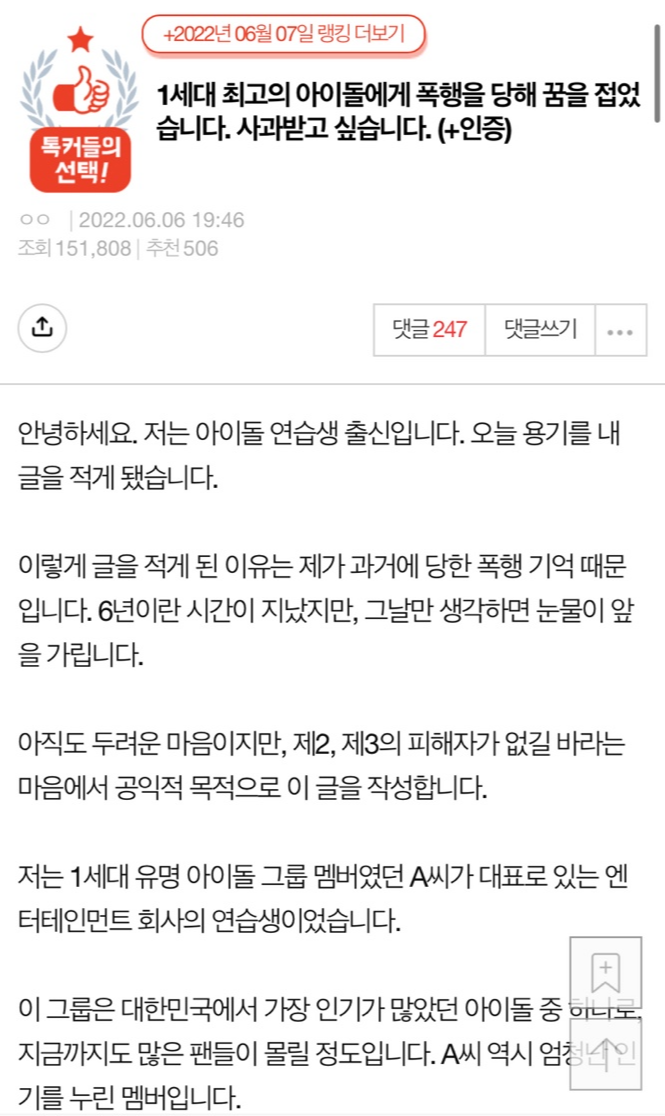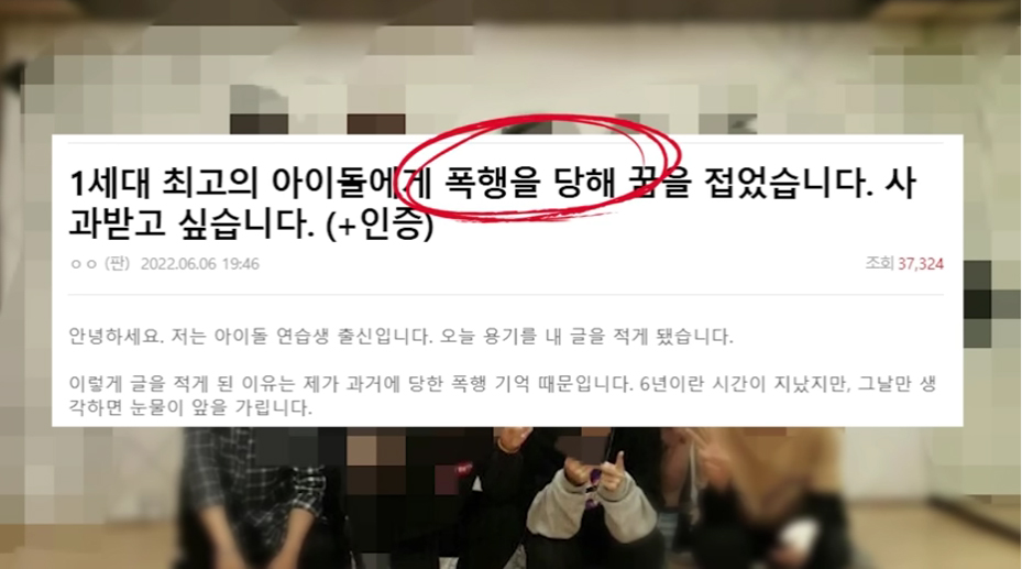 앞서 지난 6일 한 온라인 커뮤니티에는 '1세대 최고의 아이돌에게 폭행을 당해 꿈을 접었습니다. 사과받고 싶습니다'라는 제목의 글이 올라와 이목을 집중시켰습니다.