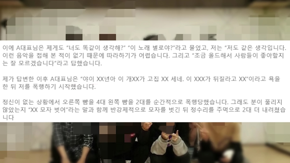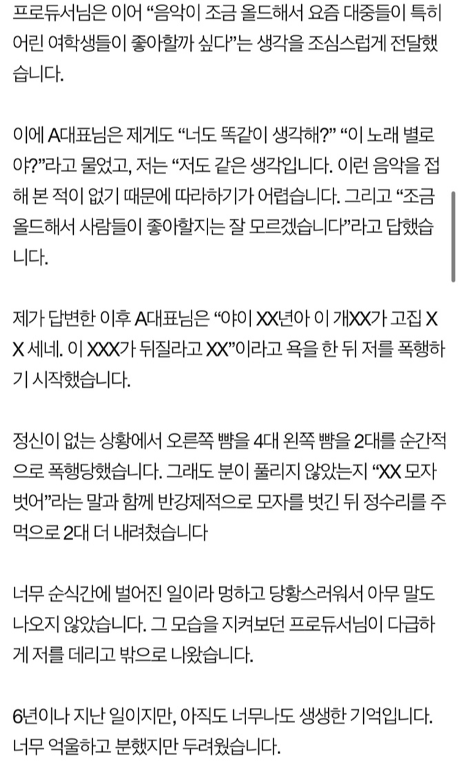 글에 따르면 A씨는 2016년 2월 18일 소속사 대표 B씨와 음악에 대한 이야기를 나누던 중 "악이 올드하다"는 의견을 밝혔다가 폭행을 당했다고 주장했습니다.