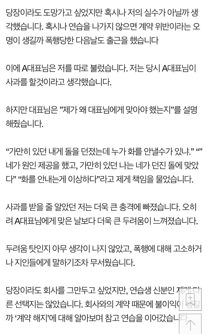 폭행 사건 이후 A씨는 대표가 "네가 원인 제공을 햇고 가만이 힜던 나는 네가 던진 돌에 맞았다"며 "오히려 A씨에게 잘못이 있다는 취지의 말을 했다고 설명했습니다.