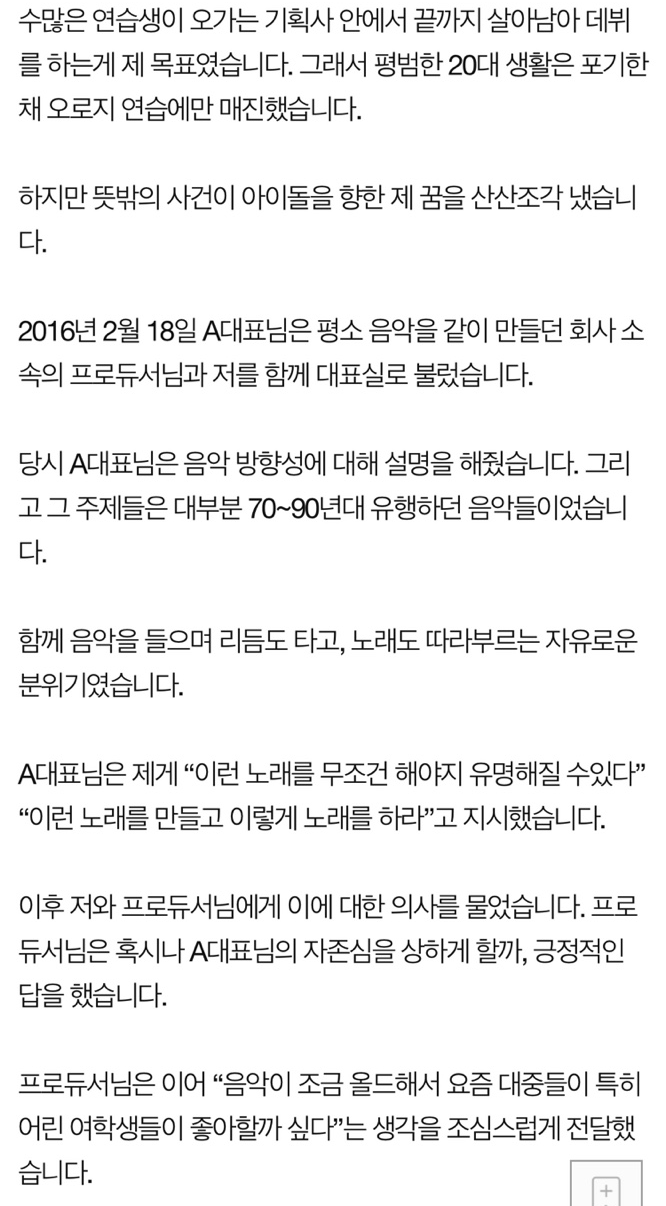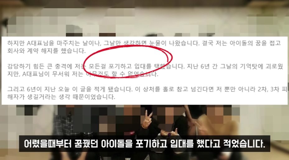 이후 아이돌의 꿈을 접고 회사와 계약해지를 했다는 A씨는 "대표님의 진정성 있는 사과를 원하고 있다"고 말했습니다.