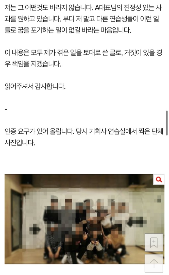 이와 함께 연습생 시절 기획사 연습실에서 찍은 단체 사진을 추가로 올렸습니다. 해당 글의 진위여부는 확인되지 않았으나 네티즌들은 A씨의 주장을 토대도 온라인에서 추측을 이어가고 있습니다.