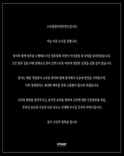 이어 스타쉽은 "남겨진 유족을 위해 고인에 대한 신상정보를 비롯, 추측은 자제해 달라"고 간곡히 부탁했습니다.