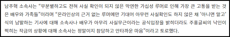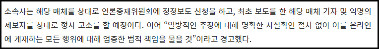 이어 "이번 기사가 나가기까지 소속사나 배우에게 단 한번의 사실 확인도 거치지 않은 매체의 일방적인 보도에 유감을 표한다"며 "당사는 이번 허위 보도로 인해 배우의 명예를 심각하게 훼손한 책임을 물어 해당 매체를 상대로 신속하게 정정보도를 신청할 예정이다. 또한 최초 보도를 한 해당 매체 기자 및 익명의 제보자를 상대로 형사 고소를 할 것"이라고 밝혔습니다.