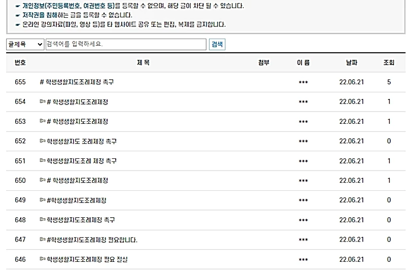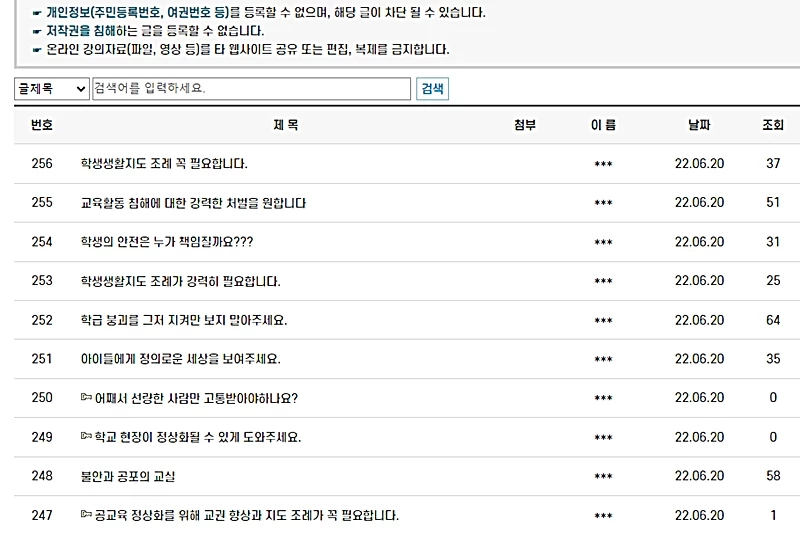 현재 익산교육지원청 홈페이지 게시판에는 A군의 강제전학 요구와 학교생활지도 조례 제정을 촉구하는 글이 잇따르고 있습니다.