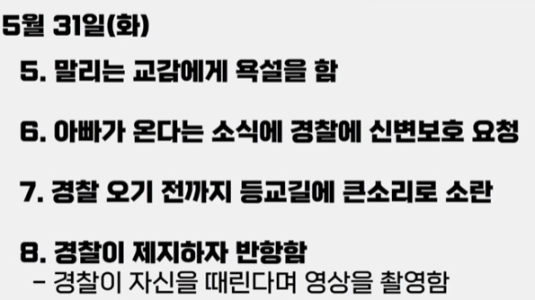 또 지난달 30일에는 같은 반 학생을 폭행했고 이를 목격한 담임교사가 제지하자 A군은 욕설을 하며 스스로 경찰에 신고했습니다. 같은 반 학생들이 선생님을 보호하겠다며 영상을 찍자 A군은 "강제 전학을 가도 나중에 찾아와 보복 하겠다"고 위협했습니다. 또 자신을 바라본다는 이유로 한 여학생의 복부와 얼굴을 공격했으며 급식실에서 흉기를 가져와 협박을 하기도 했습니다.