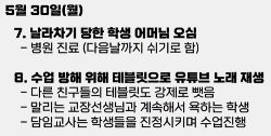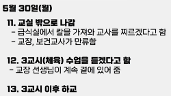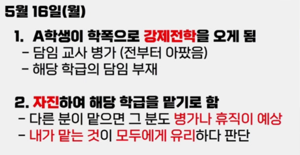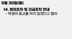 심각성을 느낀 학교 측은 A군과 그 부모에게 분리 조치 및 긴급 조치를 안내했습니다. 이후 한동안 조용하던 A군은 지난 15일 다시 학교에 찾아간다고 예고했습니다. 학교 측은 A군을 피해 급하게 현장 체험을 하는 등 공포에 떨었던 것으로 전해졌습니다.