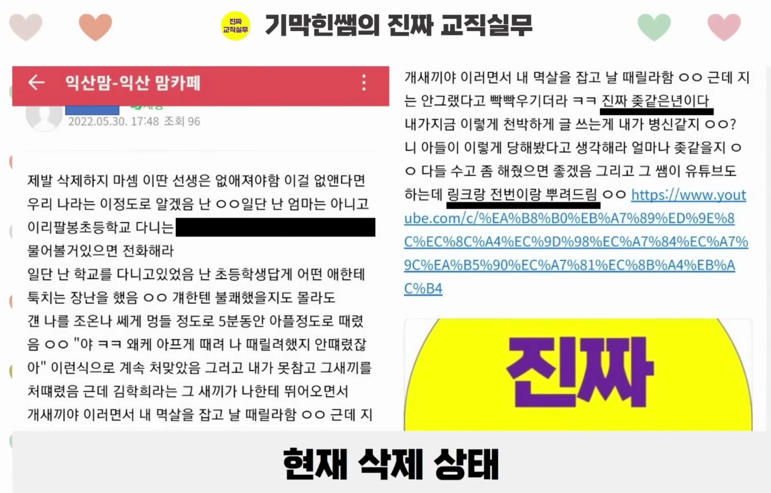 A군은 담임교사의 유튜브 채널에 댓글을 달기도 하였으며 익산 맘카페에 담임교사를 비방하는 글을 남기기도 했습니다.