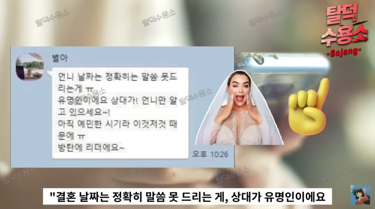 후배와 주고받은 메시지 내용도 공개했습니다. 후배는 "날짜는 정확하게 말씀 못드리는데 상대가 유명인이다. 아직 예민한 시기라 언니만 알고 있어야 한다. (예비 신랑은) 방탄의 리더"라고 말했습니다.