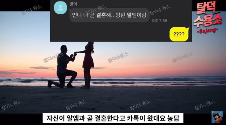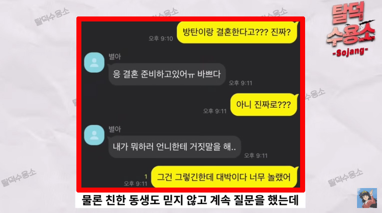 후배와 주고받은 메시지 내용도 공개했습니다. 후배는 "날짜는 정확하게 말씀 못드리는데 상대가 유명인이다. 아직 예민한 시기라 언니만 알고 있어야 한다. (예비 신랑은) 방탄의 리더"라고 말했습니다.