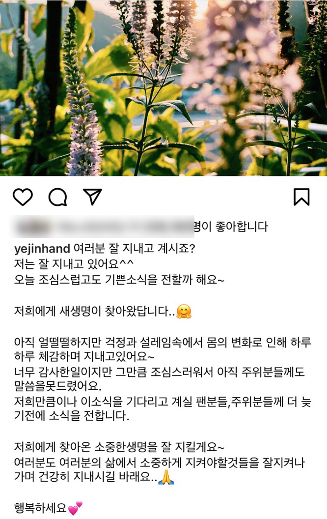손예진은 27일 자신의 인스타그램에 "조심스럽고도 기쁜 소식을 전할까 한다"며 "저희에게 새 새명이 찾아왔다"고 임신 소식을 알렸습니다.