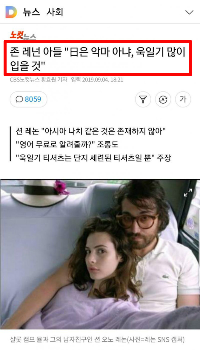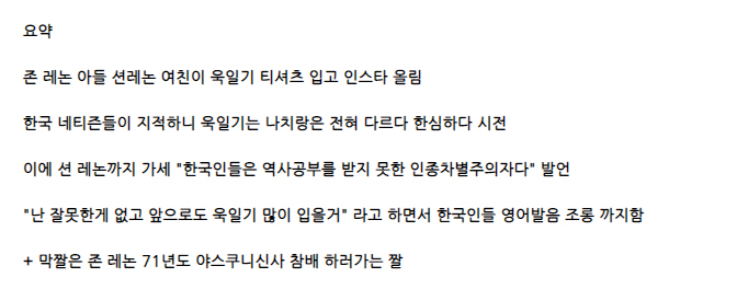 당시 션 레논의 여자친구가 욱일기가 그려진 티셔츠를 입은 사진을 SNS에 게재했는데 이를 본 한국 누리꾼들이 비판하자 션은 "한국인들은 역사 교육을 못 받은 인종차별주의자 같다" , "아시아 나치 같은 건 존재하지 않는다. 당신들이 정신이 나갔다"고 조롱했습니다.