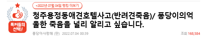 4일 온라인 커뮤니티 네이트판에는 "청주 용정동 애견호텔사고(반려견 죽음) / 퐁당이의 억울한 죽음을 널리 알리고 싶습니다"라는 제목의 글이 올라왔습니다.