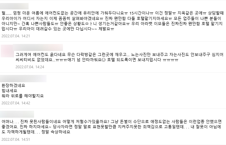 작성자는 "저희는 아이가 죽은 후 지금도 그 덥고 좁은 곳에서 괴롭게 죽었을 아이 생각에 매일을 눈물속에 죄책감에 지옥같이 보내고 있다"라며 "업체 측은 거짓말하거나 발뺌할수록 상황 악화될 거다. 증거자료 충분히 확보해두었고 형사고소 절차 진행 중"이라고 밝혔습니다.