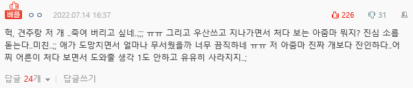그러나 일부 누리꾼들은 "어른도 개를 무서워할 수 있다. 저분이 개를 쫓으려고 다가갔다가 물려서 다쳤다면 그땐 무슨 말을 할 거냐"고 반박하기도 했습니다.