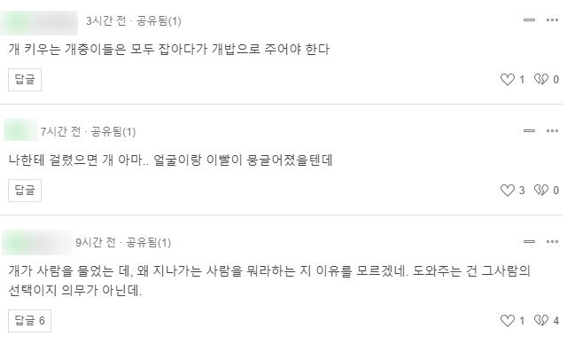 영상을 본 누리꾼들은 개물림을 당한 아이의 고통이 느껴진다며 개를 제대로 관리하지 않은 견주를 비난했으며, 일부 누리꾼들은 "우산으로 위협이라도 해주지", "어른 자격이 없다" 등의 반응을 보이기도 했습니다.