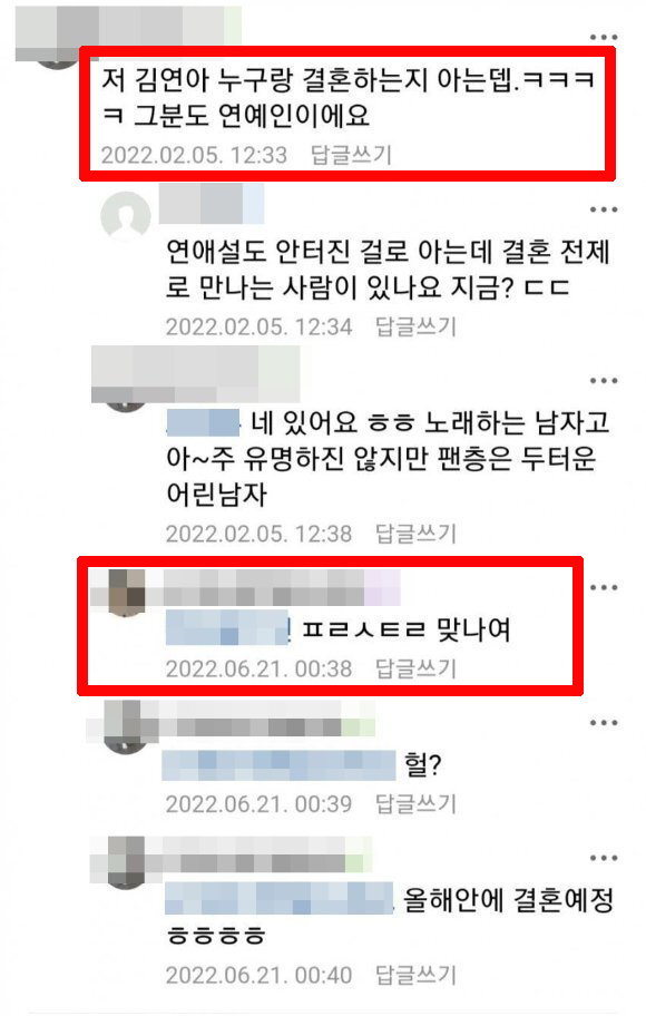 해당 댓글을 확인한 다른 누리꾼이 A씨에게 "열애설도 안 터졌는데 결혼 전제로 만나는 사람이 있나"고 묻자 "있다"며 "노래하는 남자고 유명하진 않지만 팬층은 두터운 어린 남자"라고 설명했습니다.