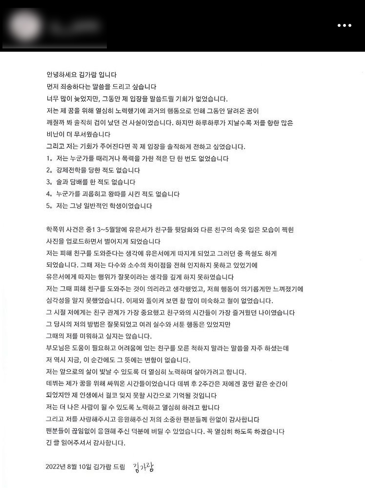 김가람은 "먼저 죄송하다는 말씀을 드리고 싶습니다. 저는 제 꿈을 위해 열심히 노력했기에 과거의 행동으로 인해 그동안 달려온 꿈이 깨질까 봐 솔직히 겁이 났던 건 사실이었습니다. 저는 기회가 주어진다면 꼭 제 입장을 솔직하게 전하고 싶었습니다"라고 입을 열었습니다.