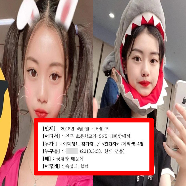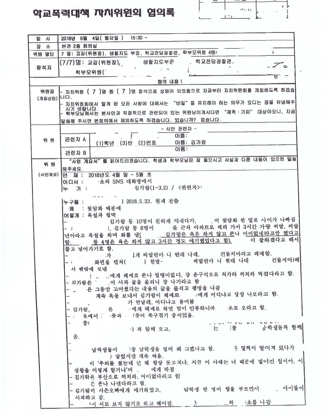 이 서류에 따르면 김가람이 관련자 여학생 4명과 함께 인근 초등학교와 SNS 대화방에서 B에게 뒷담화 때문에 욕설과 협박을 했다고 적혀 있습니다.
