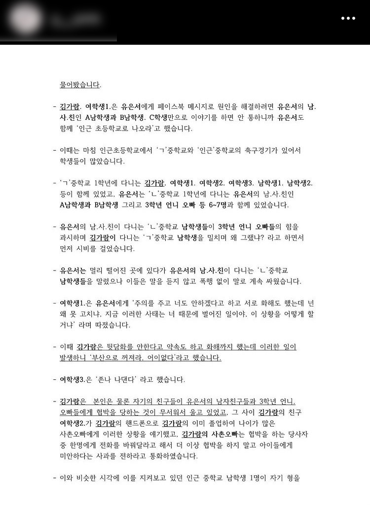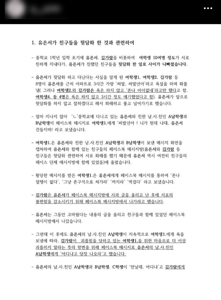 이어 "학폭위 사건은 중1 유은서가 친구들 뒷담화와 다른 친구의 속옷 입은 모습이 찍힌 사진을 업로드하면서 벌어지게 되었습니다"라며 "저는 피해 친구를 도와준다는 생각에 B에게 따지게 되었고 그러던 중 욕설도 하게 되었습니다. 저는 다수와 소수의 차이점을 인지하지 못하고 있었기에 따지는 행위가 잘못이라는 생각을 깊게 하지 못하였습니다"라고 설명했습니다.