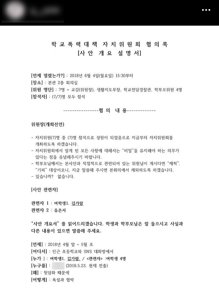 뿐만 아니라 김가람의 입장문이 공개된 A씨의 인스타그램에는 학교폭력 대책 자치위원회 협의록 중 사안 개요 설명서 서류가 공개되기도 했습니다.