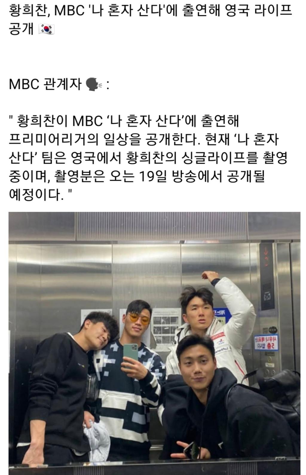 축구선수 황희찬이 19일 방송하는 '나 혼자 산다'에서 일상을 공개합니다. 제작진은 "구단 협조를 받아 영국 현지에서 촬영했다"며 "황희찬의 훈련 모습과 스물여섯살 청년의 일상을 담았다"고 밝혔습니다.