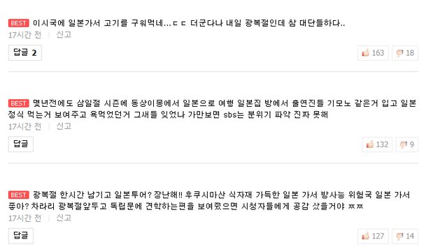 그러나 일각에서는 "예능은 예능일 뿐", "광복절 당일도 아닌데 무슨 문제인가" 등의 반박 댓글도 이어졌습니다.