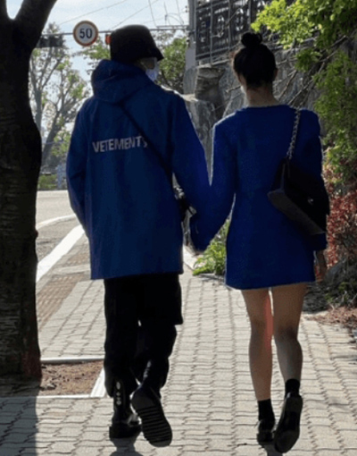 사진 속에는 파란색 외투와 검정색 긴 바지를 입은 강승윤이 시밀러룩을 입은 한 여성과 손을 마주 잡고 길거리에 나선 모습이 포착되었습니다.