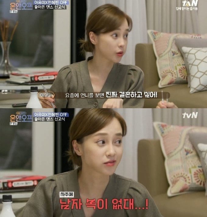 아유미는 5일 방송된 tvN 온앤오프에 출연했는데요, 아유미는 15년 지기 절친 전혜빈과 솔직하고 흥 넘치는 분위기를 뿜어냈습니다. 아유미는 전혜빈을 보면서 결혼하고 싶은 마음이 든다며 "이번에 일본에서 남자친구를 정리했다. 5년 전부터 결혼 준비는 돼 있는데 남자친구가 없다. 최근 사주를 봤는데 남자 복이 없다더라. 최악이다. 술을 같이 마셔줄 수 있는 남자, 웃긴남자, 운동하는 남자가 이상형"이라고 전했습니다.