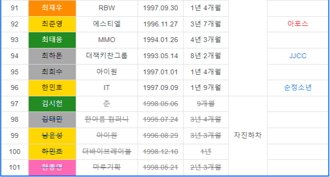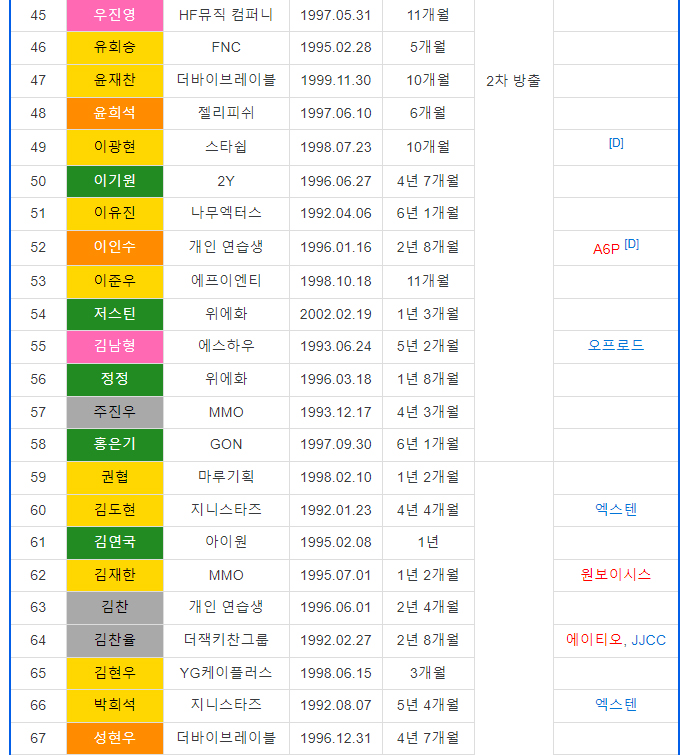 아래는 프로듀스101 시즌2에 출연했던 출연자 참가자 명단입니다.