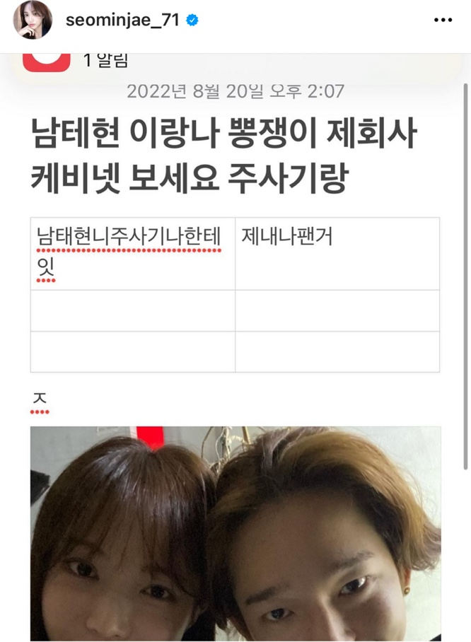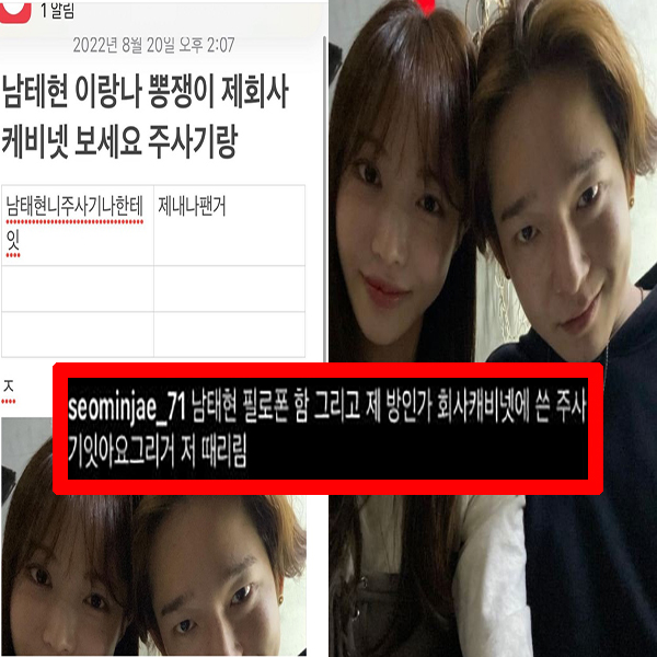 공개된 사진 속에는 서민재와 남태현이 나란히 머리를 맞대고 셀카를 찍고 있는 모습이었습니다. 해당 게시글은 삭제됐지만 이후 계속해서 '남태현 주사기 나한테 있다', '아 녹음있다 내폰에', '그땐 사랑이어' 등과 같은 게시물이 잇달아 올라오거나 사라지기를 번복하고 있습니다.