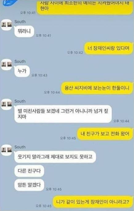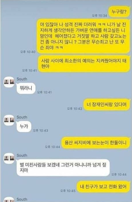 이 대화에서 A씨는 "그분은 무슨 죄고 난 또 무슨 죄야. 사람 사이에 최소한의 예의는 지켜줬어야지 태현아"라며 "너 장재인 씨랑 있다며. 용산 CGV에 보는 눈이 한 둘이니. 내 친구가 보고 전화 왔어"라고 하자 남태현은 "뭐라니. 별 XX 사람들 보겠네. 그런 거 아니니 넘겨짚지 마. 다른 친구다"라고 말했습니다.