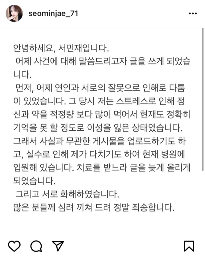 서민재는 "어제 연인과 서로의 잘못으로 인해 다툼이 있었습니다. 그 당시 저는 스트레스로 인해 정신과 약을 적정량보다 많이 먹어서 현재도 정확히 기억을 못 할 정도로 이성을 잃은 상태였습니다"라고 밝혔습니다.