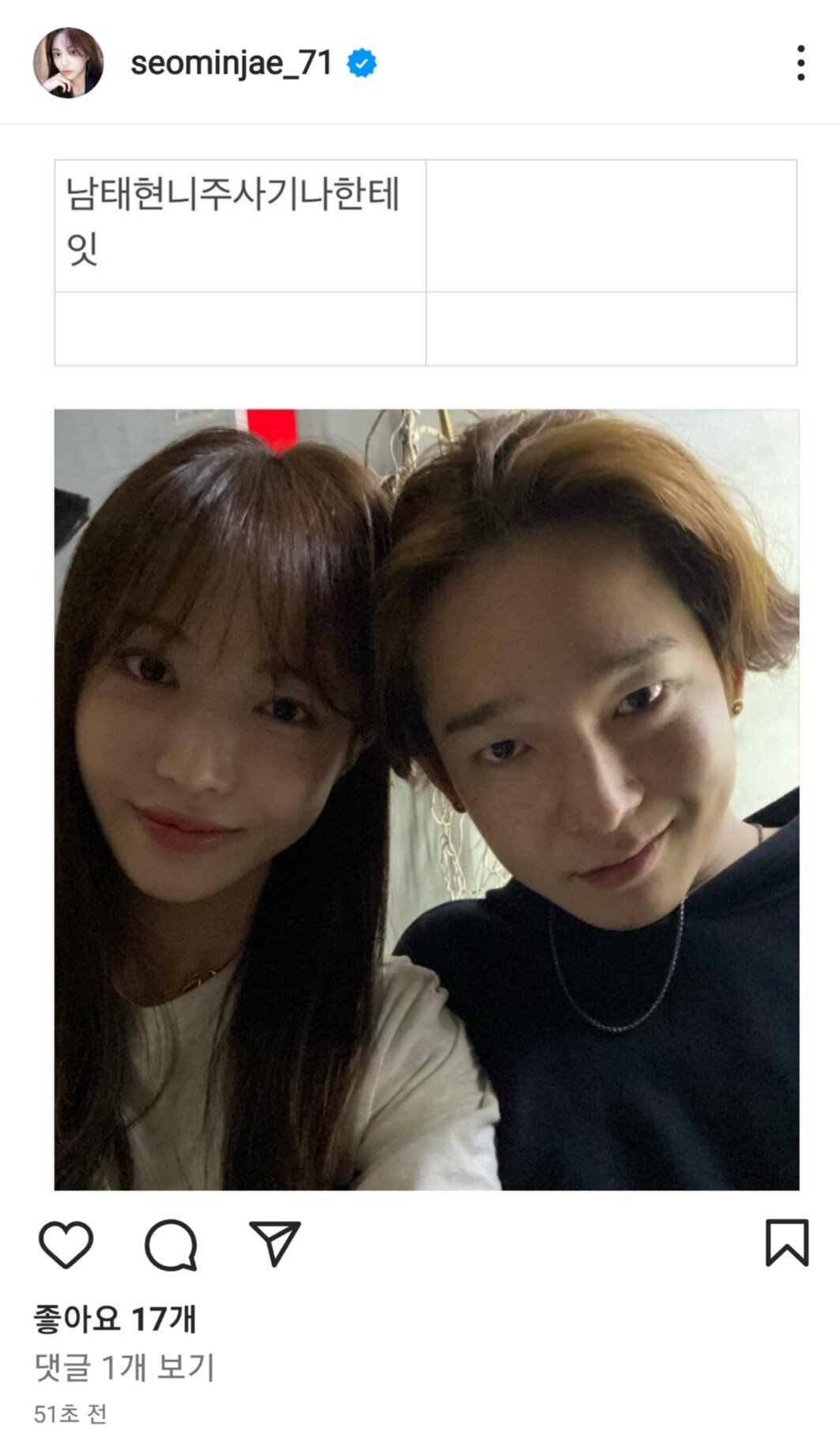 서민재는 20일 인스타그램 계정에 남태현과 찍은 사진을 올리며 "남태현 필로폰 함, 그리고 제 방인가 회사 캐비닛에 쓴 주사 있어요, 그리고 저 때림"이라는 글을 올렸습니다
