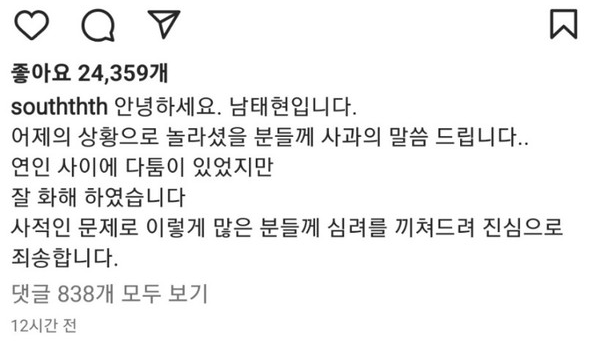 이에 남태현은 21일 자신의 인스타그램을 통해 "어제의 상황으로 놀라셨을 분들께 사과의 말씀 드린다"며 "연인 사이에 다툼이 있었지만 잘 화해했다. 사적인 문제로 이렇게 많은 분들께 심려를 끼쳐드려 진심으로 죄송하다"며 사과문을 올렸습니다.