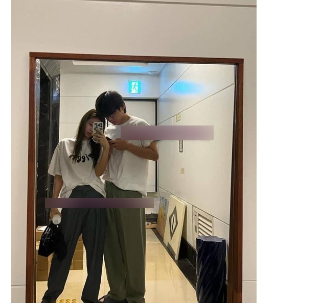 사진 속에서 뷔와 제니는 흰 티에 카키색 바지로 시밀러 룩을 연출한 채 함께 거울 셀카를 찍고 있습니다. 뷔 제니 두 사람은 어깨를 붙이고 여느 연인처럼 다정한 포즈를 취했습니다.