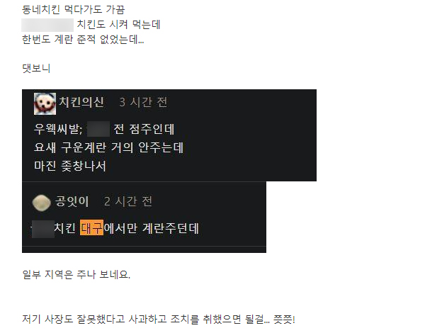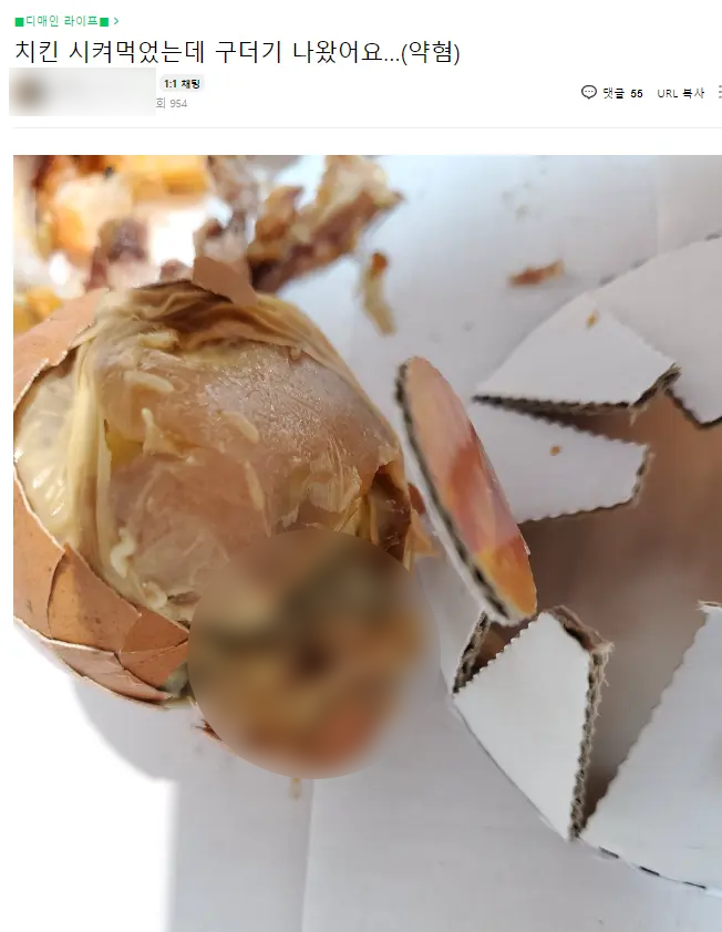 치킨과 함께 온 구운계란에 구더기 비위생 논란 (+어디)
